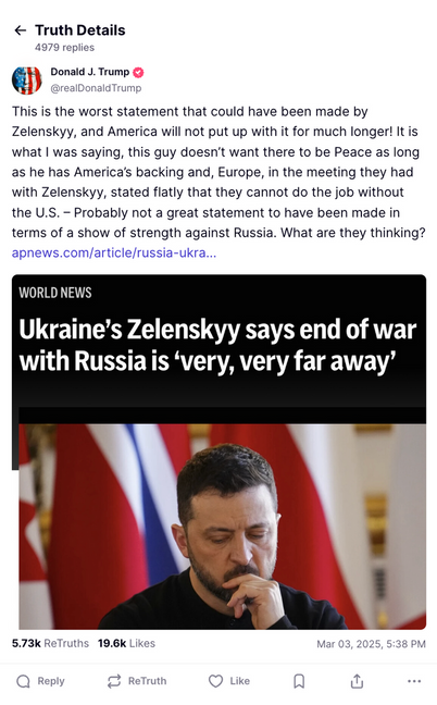 Trumps inlägg följer det omtalade mötet i Ovala rummet förra fredagen, som avbröts i förtid efter en ordväxling mellan presidenterna inför öppna kameror.