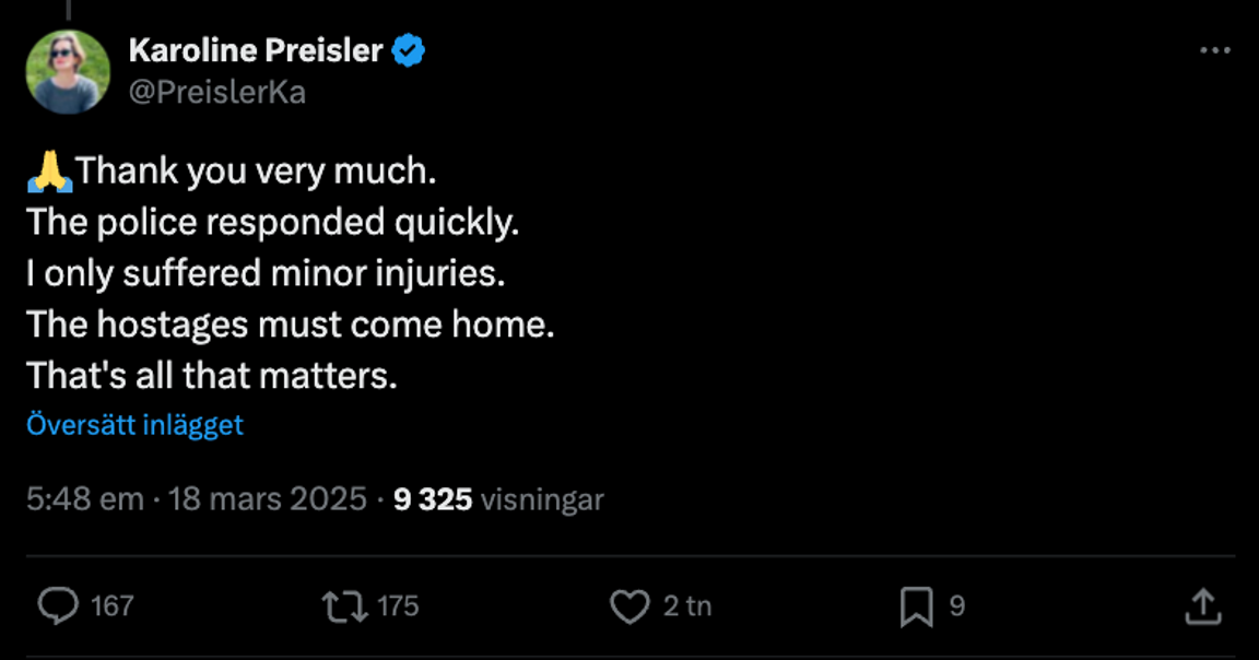 ”Polisen reagerade snabbt. Jag har endast ådragit mig mindre skador,” skriver Preisler på X. Trots attacken väljer hon att fokusera på Hamas gisslan: ”Gisslan måste komma hem. Det är allt som betyder något.”