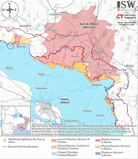 Särskilt intensiva har stridshandlingarna blivit i regionens nordöstra del, där ukrainska styrkor genomfört en serie motattacker, inklusive bekräftat framryckande vid Kyndrativka. Sumys regionala militäradministration uppger att man aktivt bygger upp försvarslinjer, minröjer och ingenjörsmässigt förstärker befästningar - allt för att förhindra ett djupare genombrott av fienden.