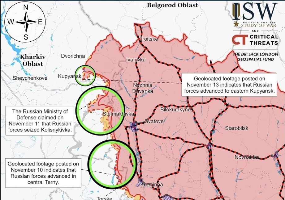 Enligt ukrainska militära källor trängde ryska luftlandsättningstrupper in i Kupjansk i Charkivregionen den 13 november. Två kolonner bröt sig in i staden. Anfallet genomfördes, enligt samma källor, i fyra vågor med 15 pansarfordon, inklusive stridsvagnar, pansarfordon och minröjningsfordonet UR-77.