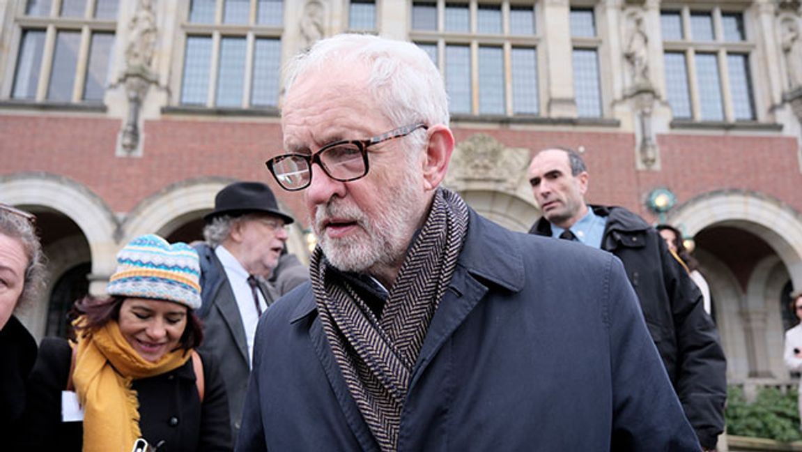 Jeremy Corbyn vid Internationella domstolen i Haag när Sydafrika lade fram anklagelser om folkmord i Gaza i januari 2024. Bild: AP Photo/Patrick Post