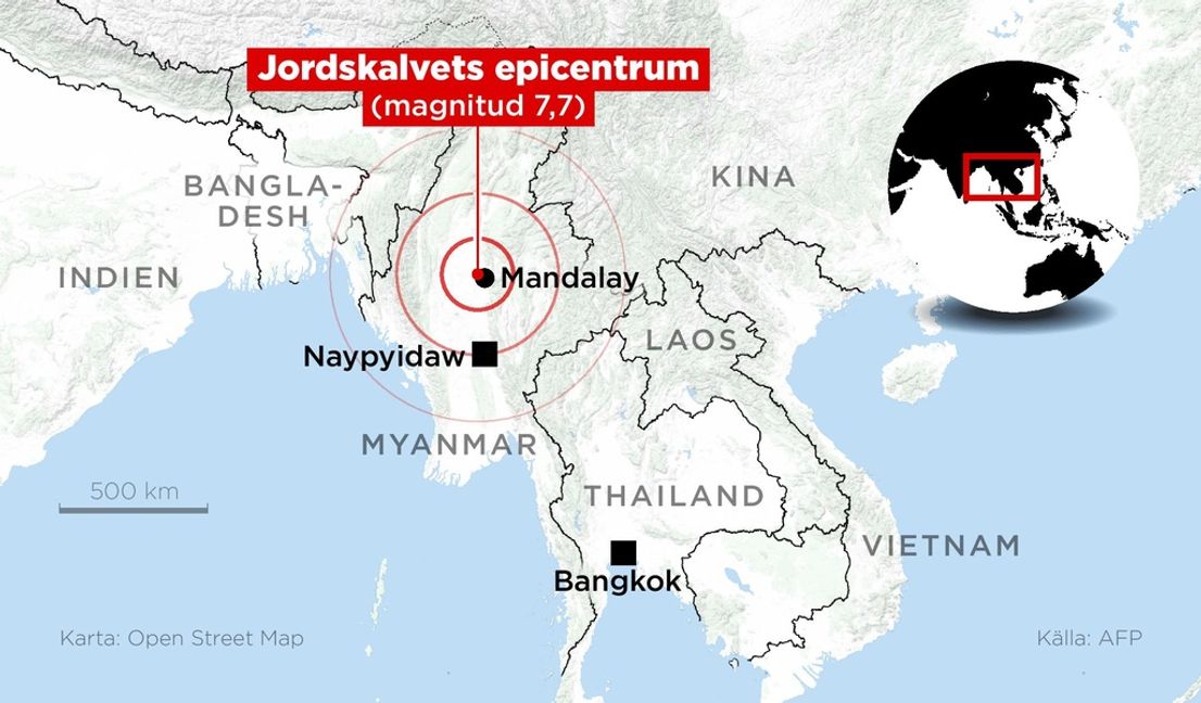 En kraftig jordbävning med magnituden 7,7 har skakat Sydostasien. USA:s geologiska myndighet befarar tusentals dödsoffer. I Thailands huvudstad Bangkok har ett höghusbygge rasat. Farhågorna växer för konflikthärjade och juntastyrda Myanmar, där skalvet hade sitt centrum.