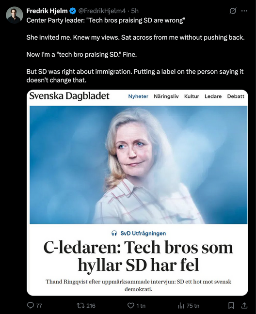 När Centerpartiets ledare Elisabeth Thand Ringqvist i en intervju med SvD kallade ”tech bros” analys för ”helt fel” dröjde det inte länge innan Voi-grundaren Fredrik Hjelm reagerade. Han bjöds in av henne själv till Kvartals partiledarintervju – och står fast i en sakfråga: SD hade rätt om migrationen.