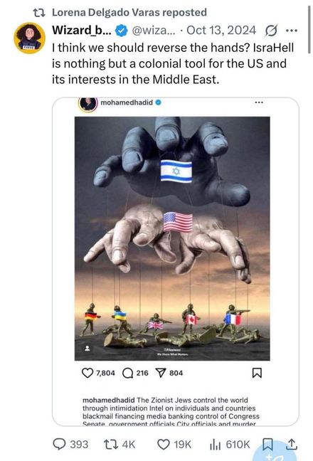 Det senaste som väckt uppmärksamhet är att Delgado Varas delade en bild som föreställer hur Israel kontrollerar USA, som i sin tur kontrollerar andra stater. Det är en klassisk antisemitisk trop – idén om att judar styr världen. Bildtexten talar om hur ”sionistjudarna kontrollerar världen”.
