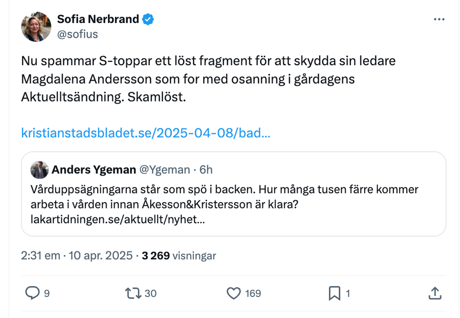 Kristianstadsbladets politiska redaktör Sofia Nerbrand återdelar ett inlägg av S-profilen Anders Ygeman och kommenterar: ”Nu spammar S-toppar ett löst fragment för att skydda sin ledare Magdalena Andersson som for med osanning i gårdagens Aktuelltssändning. Skamlöst.”